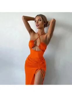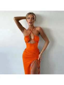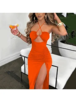 Drawstring,Halter,Patchwork,Pullover,Pure Color,Ruched,Solid Color,Split Hem,Bodycon,Terylene,Halter neck,Sleeveless